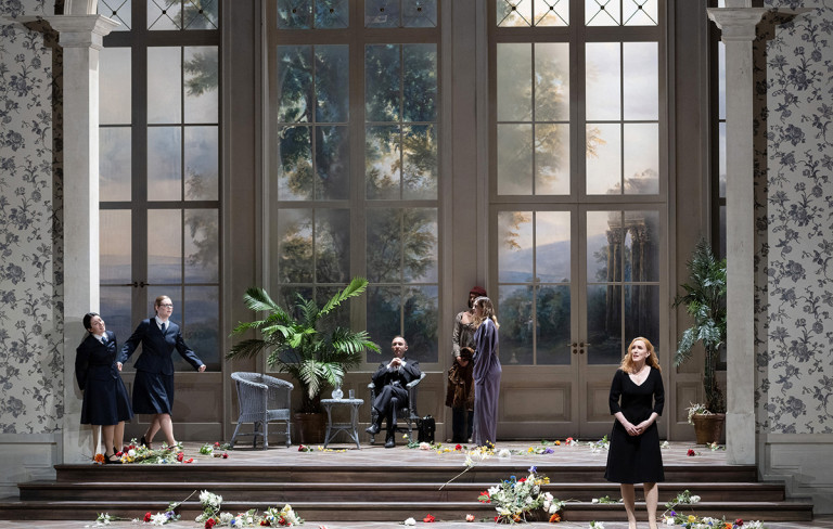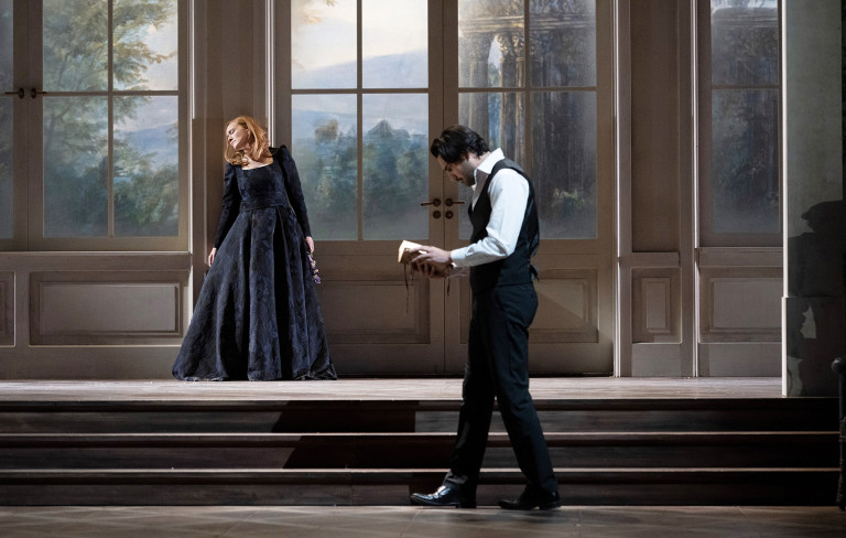 Christof Loy fidèle à sa marque de fabrique, excellent directeur d'acteur, nous propose un décor unique, portes côté cour et jardin, s'ouvrant sur de sombres corridors, longues marches blanches en marbre menant à d'immenses fenêtres derrière lesquelles une toile peinte qui monte jusqu'aux cintres, représente un paysage rafraîchissant très peintures bucoliques éclairé différemment selon les moments du jour. Accessoires très dépouillés, comme toujours également, candélabre, arbalète, chaises, lutrin, luth, en rapport avec l'action. Noir ou blanc, les personnages sont élégamment habillés, sobrement pour l'essentiel, Loy joue sur la symbolique des caractères des uns et des autres, et sa mise en scène très théâtrale, n'en rajoute jamais bien au contraire, permettant au spectateur de se concentrer sur ce qui se chante tout en profitant de l'excellent jeu d'acteurs des personnages.