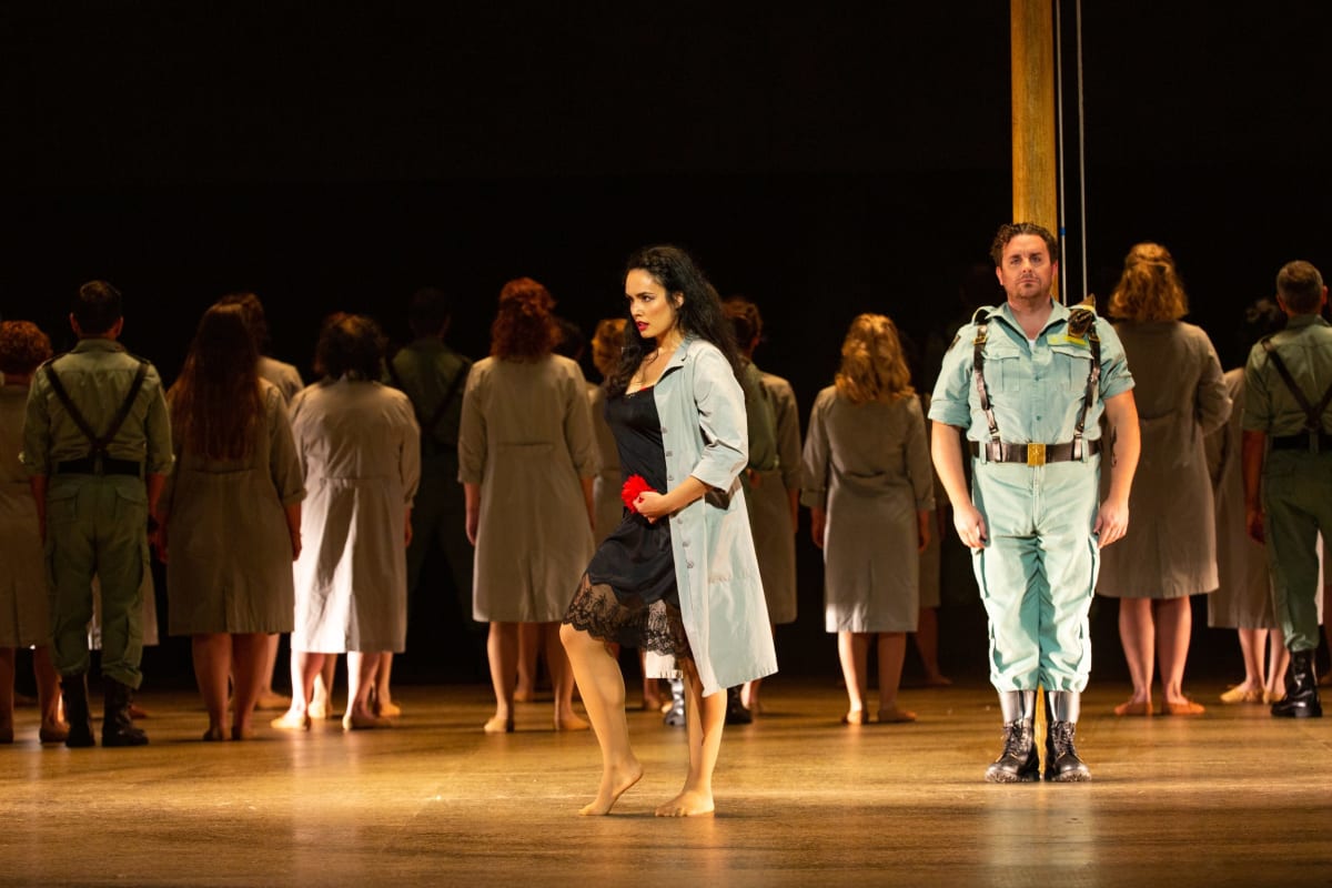 Or cette mise en scène, qui ne vieillit pas trop mal et est devenue un classique depuis 20 ans qu'elle fait le tour des scènes (Barcelone, Paris pour la 43ème fois d'après le petit papier généreusement donné par l'OnP, Venise, Vienne), demande d'excellents acteurs capables d'occuper un plateau immense et très souvent vide puisqu'il représente l'arène de sable des corridas tout comme la place de Séville ou les montagnes où se réfugient les bohémiens. Quand il est occupé, c'est par une cabine téléphonique et un grand mât d'une part, des bagnoles d'autre part, les uns et les autres conduisant à une sorte de chorégraphie assez complexe de la part des solistes. Les mouvements de foule des chœurs (foule, enfants, soldats, bohémiens) forment également des tableaux millimétrés, l'une des grandes forces illustratives du mouvement et de l'action chez Bieito qui nous propose une Espagne des années 70 encore sous le joug franquiste.