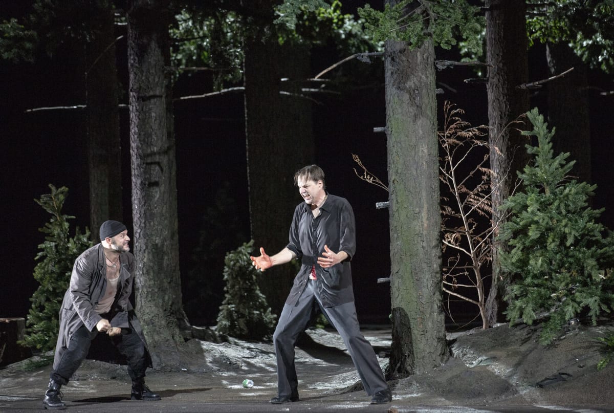 Le parti pris de Claus Guth est celui d’un contraste absolu entre un Leporello plus bouffon que jamais et un Don Giovanni véritable prédateur qui hante une sombre forêt tel un félin prêt à fondre sur ses proies. Animal blessé suite au combat où il tue le Commandeur, il s’enfonce peu à peu dans une sinistre quête entre les arbres dont on ne voit pas les cimes, évoquant tour à tour la blessure fatale d’Amfortas (surtout incarné par l’inoubliable et magistral Peter Mattéi), et les forêts des œuvres du romantisme allemand qui suivront Mozart, O combien précurseur dans ce magistral opéra.