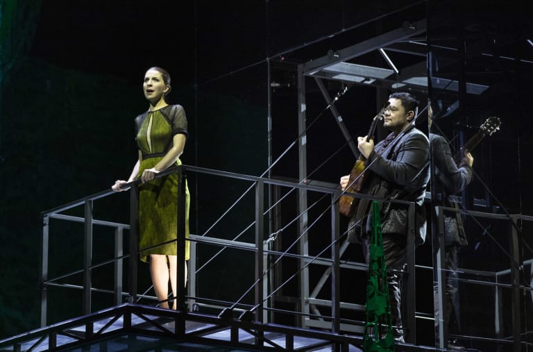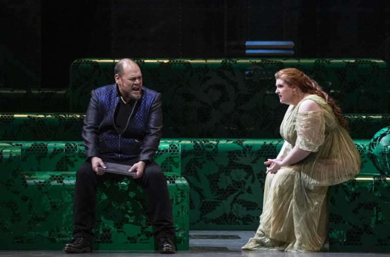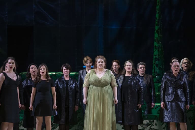 Il est vrai qu’aucun chanteur n’est aidé par la conception de Peter Sellars qui, du fait d’un décor envahissant (vert ou rouge selon les moments), les contraint à rester loin les uns des autres ou à se trouver une place en avant-scène, où ils chantent parfois en rang d’oignons comme dans une version-concert. Sellars transpose cette histoire de nos jours dans un quelconque pays de dictature où se pratique la torture et la peine de mort.